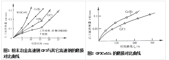 3 粉末冶金高速鋼的切削試驗(yàn)作者用粉末冶金高速鋼GF3制成車刀,在相同的切削條件下與普通高速鋼W18Cr4V及熔煉高性能高速鋼Co5Si,V3N進(jìn)行切削對(duì)比。