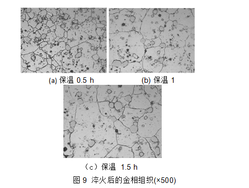 (2)熱處理。正確的熱處理工藝,對(duì)于提高粉末高速鋼的性能是非常必要的,T15 粉末高速鋼的淬火溫度大概為1 230~1 260 ℃,我們選擇了 1 240 ℃,希望通過(guò)延長(zhǎng)淬火保溫時(shí)間來(lái)溶解大尺寸的碳化物。我們?nèi)×酥睆綖?10 mm 的小樣,分別保溫 0.5 h、1 h 和 1.5 h 作為對(duì)比,圖 9 為淬火后的組織圖。由圖 9(a)可以看到,保溫 0.5 h 晶粒未長(zhǎng)大,但是碳化物尺寸并沒(méi)有減?。挥蓤D 9(b) 可以看到,保溫 1 h 后晶粒明顯長(zhǎng)大,但是碳化物尺寸沒(méi)有改變;而圖 9(c) 保溫 1.5 h 后,晶粒明顯長(zhǎng)大,并且伴隨著少量的晶界熔化,而碳化物尺寸仍然沒(méi)有減小的趨勢(shì)。由此我們可以知道,延長(zhǎng)熱處理保溫時(shí)間對(duì)減小碳化物的尺寸,也是沒(méi)有效果的。由于大尺寸的碳化物主要分布在顆粒邊界處,顆粒邊界由于氧化物等雜質(zhì)元素富集,這些都增加了碳化物溶解的阻力。