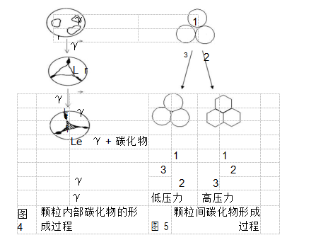 [3]。其主要過(guò)程是液相與固相共存區(qū),降低溫度冷卻時(shí),液相首先轉(zhuǎn)變?yōu)閵W氏體相(即 L → γ),隨后溫度繼續(xù)降低,在奧氏體相之間剩余的液相發(fā)生共晶轉(zhuǎn)變,轉(zhuǎn)變?yōu)閵W氏體和碳化物(即 Le → γ + 碳化物),直到最終全部轉(zhuǎn)變?yōu)楣滔酁橹?,此類碳化物在顆粒內(nèi)部,抑制了碳化物的長(zhǎng)大。對(duì)于第二類碳化物,結(jié)合熱等靜壓的原理以及碳化物析出的形貌分析,本文提出了碳化物析出-聚集長(zhǎng)大的碳化物粗化模型(如圖 5 所示),在高壓條件下,顆粒間比較致密,顆粒間形成的碳化物比較細(xì)??;在低壓條件下,顆粒間比較疏松,顆粒間形成的碳化物就比較粗大。