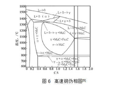 為了進(jìn)一步解釋本文提出的碳化物析出-聚集長(zhǎng)大的碳化物粗化的模型,從熱力學(xué)和動(dòng)力學(xué)方面進(jìn)行了分析。圖 6 為高速鋼偽相圖,T15 粉末高速鋼含碳量為 1.5% ~ 1.6%,在1 100~1 150 ℃的熱等靜壓溫度下,組織中存在液相、碳化物和奧氏體化區(qū)域,也就是說(shuō)在保溫加壓階段,碳化物已經(jīng)開始析出。因?yàn)轭w粒大多數(shù)為球形,所以當(dāng)壓力過(guò)低時(shí),在顆粒與顆粒之間會(huì)存在較大的空隙,由于顆粒邊界能量較高,碳化物優(yōu)先在顆粒邊界析出,這時(shí)候顆粒邊界析出的碳化物,會(huì)輕而易舉的占據(jù)這個(gè)空隙,與相近的碳化物接觸,從而聚集長(zhǎng)大,形成了粗大的碳化物。這時(shí)候的熱等靜壓壓坯的致密,其實(shí)是偽致密,甚至有時(shí)候會(huì)出現(xiàn)所測(cè)密度大于理論密度的現(xiàn)象。而當(dāng)壓力提高時(shí),顆粒受到較大壓力的作用,形狀發(fā)生改變,朝著有利于顆粒之間空隙減小的方向發(fā)展,結(jié)果就是顆粒之間的空隙大大減小甚至消失。這時(shí)候在顆粒間隙上形成的碳化物尺寸,也就相應(yīng)大大的縮小,碳化物會(huì)細(xì)小均勻地彌散在顆粒中,這和圖 2 所示的實(shí)驗(yàn)結(jié)果是一致的。