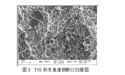 所選熱等靜壓壓力為 65 MPa,溫度為 1 150 ℃,保溫 3 h,壓坯組織圖如 2(a)所示,得到了粗大碳化物,最大尺寸可達(dá)15~20 μm,并且粗大的碳化物大多數(shù)都在三個(gè)顆粒的邊界交叉處聚集長(zhǎng)大,經(jīng)過(guò)熱處理后,硬度最高只能達(dá)到 65 HRC,抗彎強(qiáng)度最高只有 2 000 MPa 左右,還不及熔煉高速鋼的水平。斷口組織如圖 3 所示,可看到斷裂基本上是沿著大尺寸碳化物組織發(fā)生。碳化物主要是碳化鎢和碳化釩,析出的大尺寸碳化物是性能較低的主要因素。在 65 MPa 的壓力下,把熱等靜壓溫度降低了 50 ℃,壓坯組織圖如 2(b)所示,碳化物尺寸沒(méi)有減小,與圖 2(a) 組織圖沒(méi)有多大差別,因此我們排除了溫度這個(gè)影響因素。并且粉末中的碳化物也是細(xì)小彌散分布的,可知大尺寸的碳化物形成主要是我們采用了低壓,一般壓力應(yīng)該在 100 MPa 以上